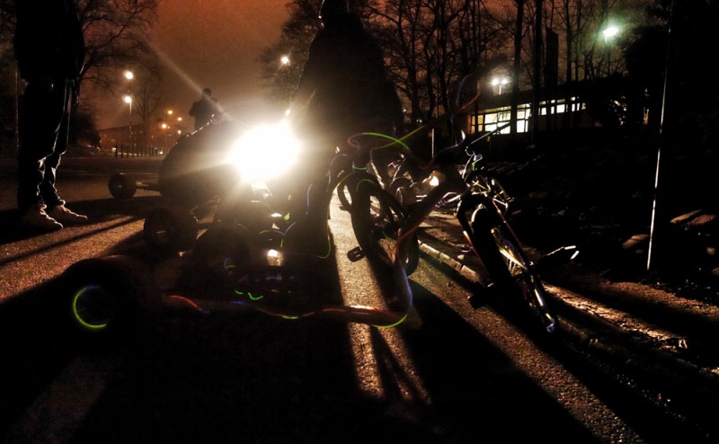Do masek dorzuciliśmy fajne ciuszki oklejone światełkami fluorescencyjnymi i wszytko zaczęło składać się do kupy. Odjechane podświetlone rowerki, maski Predatora, świecące kombinezony. Nic tylko jechać w miasto. Snuliśmy się po głównych ulicach Warszawy, budząc wśród przechodniów niemałe zdziwienie. Jedni się śmiali, kolejni trochę bali ale co najważniejsze nikt nie pozostawał obojętny. Nie mieszając się w politykę wpadliśmy na sobotnie demonstracje na Alejach Ujazdowskich, pstrykneliśmy fote z Józefem Piłsudskim, podjechaliśmy pod Ruską ambasadę, Pałac Prezydenta, odpalaliśmy race na ul. Karowej, Tamce i Oboźnej. I jako, że żyjemy w państwie policyjnym jedna tylko rzecz nas zmartwiła, brak jakiejkolwiek reakcji ze strony naszej szanownej władzy. No, ale może nie nagięliśmy prawa odpalając race świetlne w samym centrum miasta. Nie nam to oceniać;-) Pozdrawiamy nasza kochaną Stolicę i zapraszamy do obejrzenia galerii z Niemul Psycho Riderami;-)))